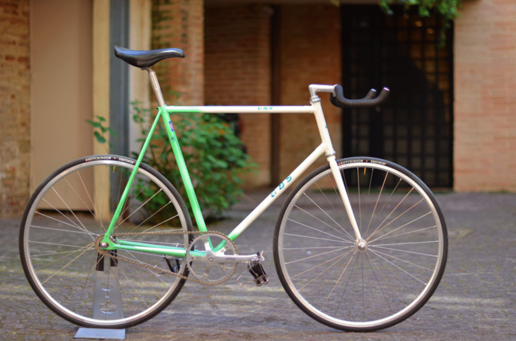 Un montage franco-italien-japonais avec potence Nitto Pearl NJS / cintre Nitto RB-002 Pédalier Campagnolo pista / Paire de roues Mavic Open pro sur moyeux Durace petites flasques