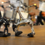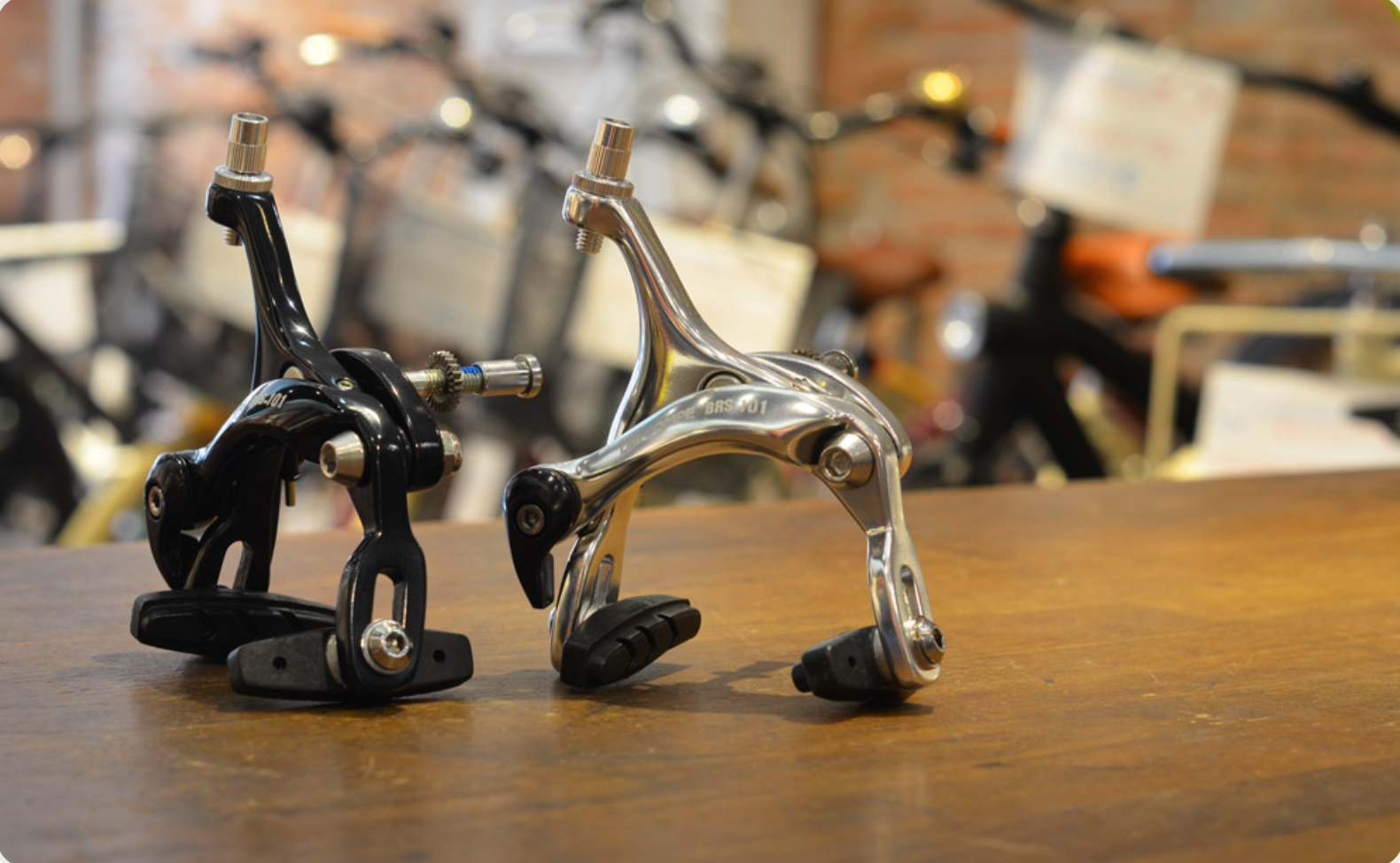 Etrier de frein double-pivot Dia-Compe BRS 101 N : Aluminium forgé à froid anodisé argent ou noir, patins à angle réglable. Pour fourche avec longueur de 45 à 57mm
