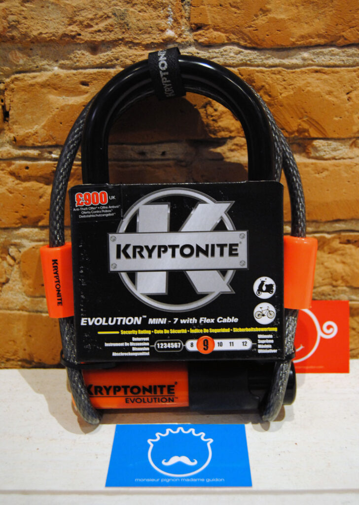 Cadenas pour vélo Kryptonite Evolution Mini U-Lock 7″ avec câble flex : 75€ Légèrement plus grand que son petit frère le Krypto Mini 5