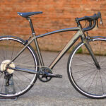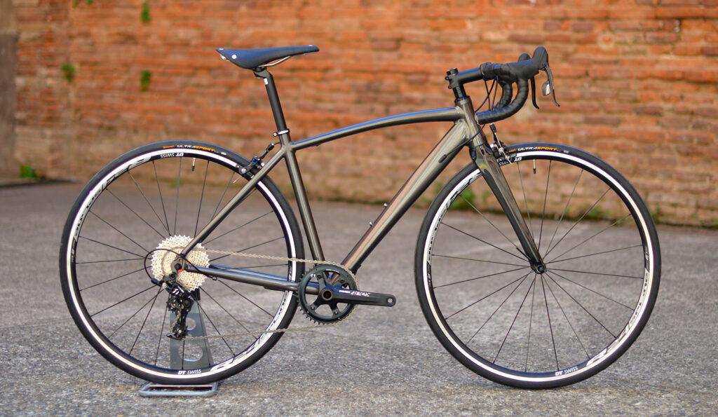 Raymond de sortie avec une robe grise. Notre vélo de route mono-plateau prêt à découvrir les pentes du col du tourmalet.