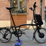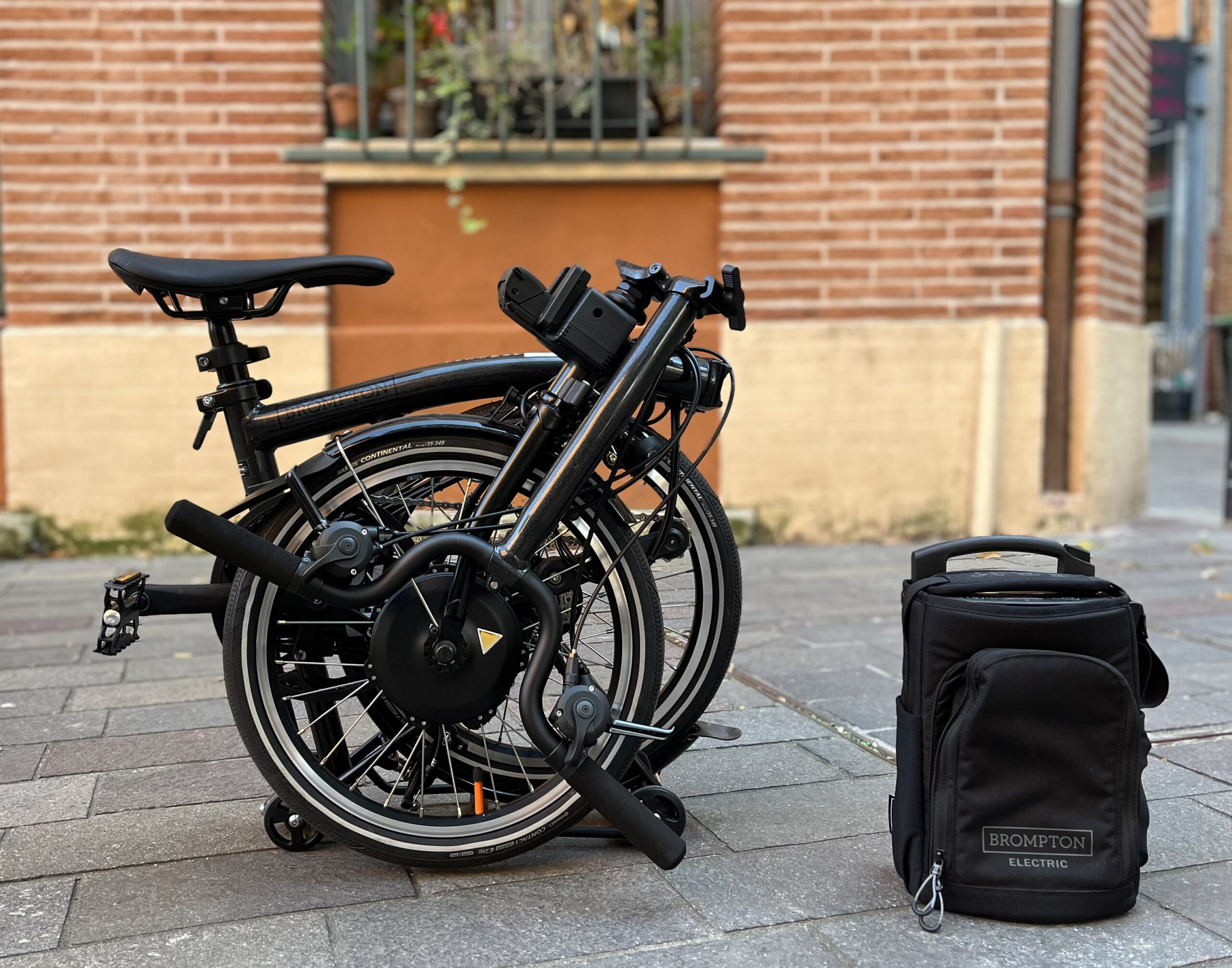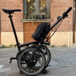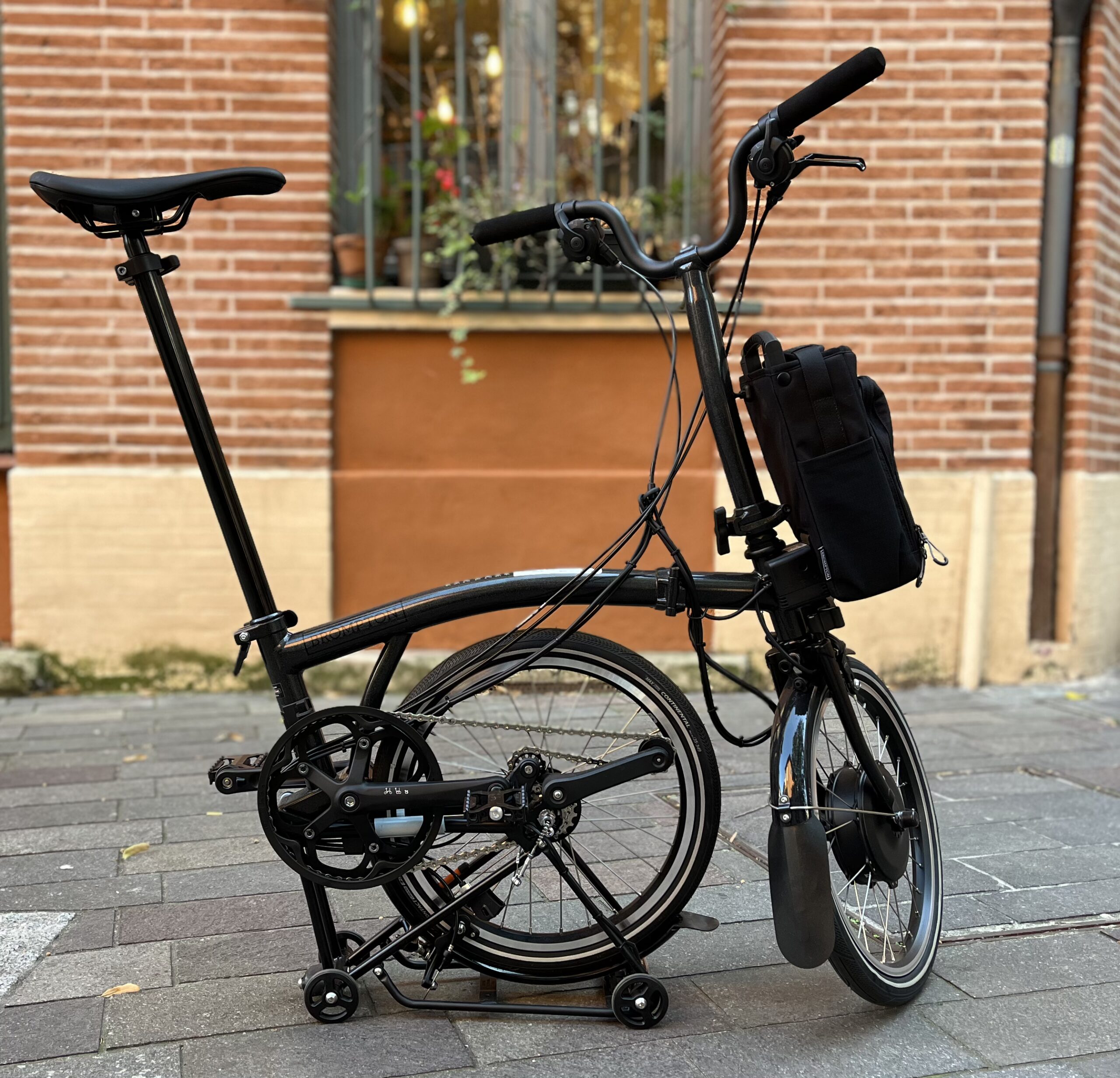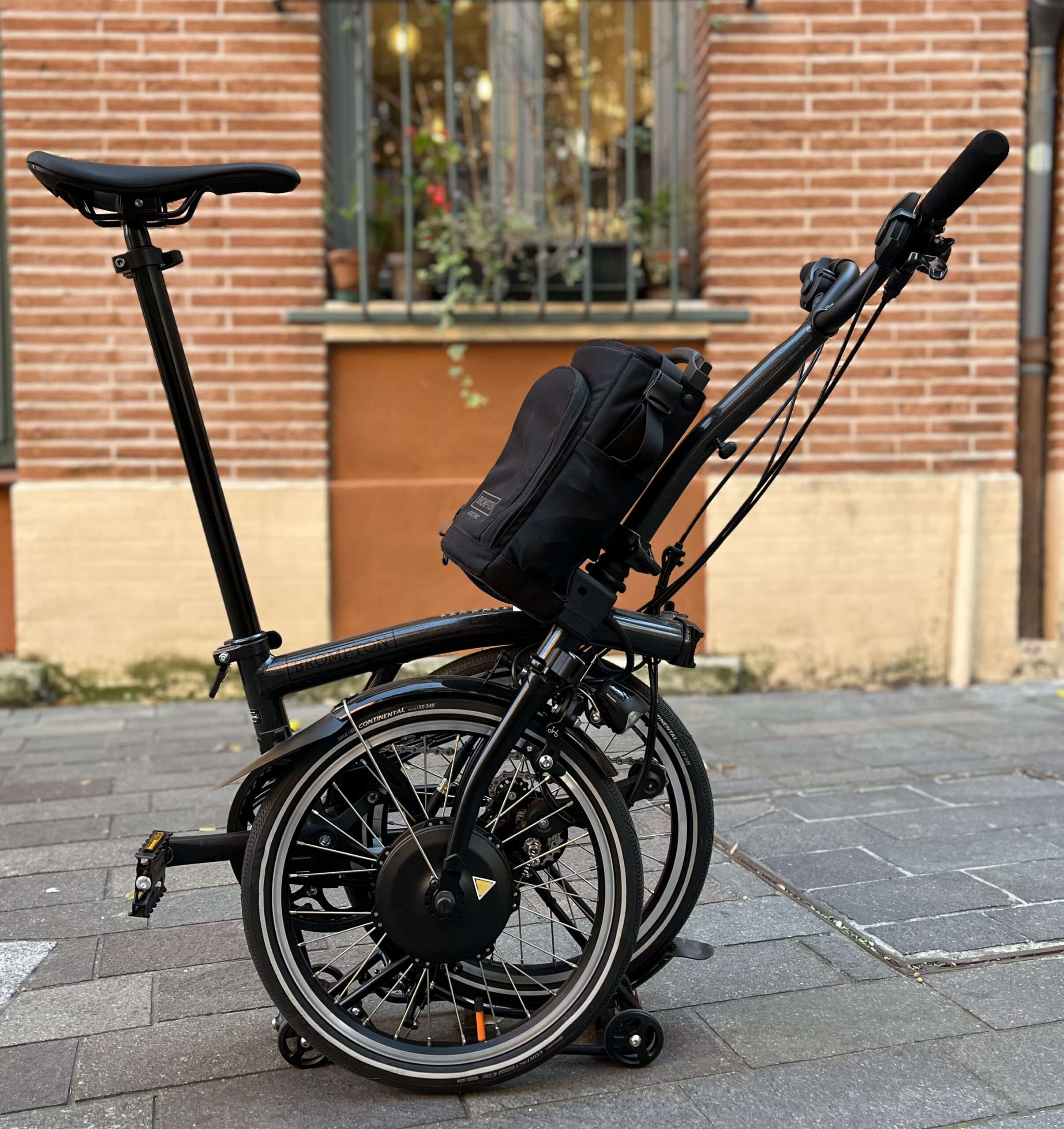Les sacs Brompton se fixent rapidement et solidement au bloc porteur avant, garantissant stabilité et équilibre même chargé.